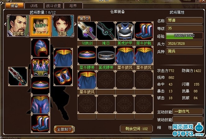 先说下我的培养,都是培养李牧 李牧,纯输出,全部洗攻击+攻击宝石(最好的攻击装备给他) 不伟,纯防御,全部洗防御+防御宝石 琴清,纯防御,全部洗防御+防御宝石(最好的防御装备给他) 庞涓,攻防公用,主要攻击,6件攻击,其他防御 琴清: