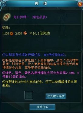 每个34级以上的玩家都可以在凌风城镖局的总镖头处领取押镖任务,镖车可分为多个品质,分别为白色、绿色、蓝色、紫色.接到不同品质的镖车可以获得不同倍数的奖励加成.这是玩家获得第一桶金的唯一方式!