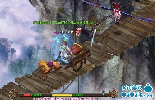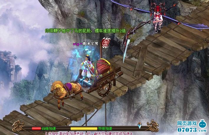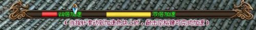 当玩家接到押镖任务之后,玩家人物下方就会出现一个滚动的加速条,当加速条上的指针指到黄色区域内按下空格键,就可以获得双倍加速效果,当指针指到红色区域内,就可以获得四倍速度的急速效果!当玩家通过加速3分钟之内完成押镖任务之后,会获得额外丰厚的金钱和经验奖励哦!