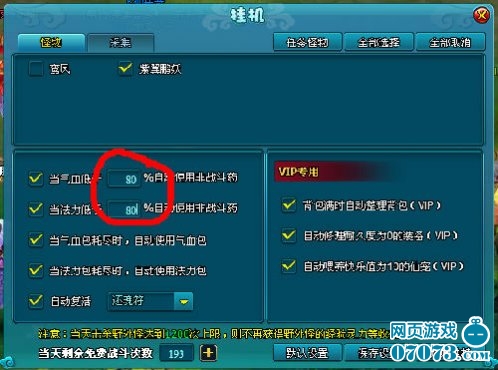 作为一名资深玩家,我建议大家这么设置:按照图中标红的位置,把气血和法力两项改成80%的时候使用药物。我们要尽量及时地补充药物,不然战斗中是不能补药的,你只能眼睁睁地看着只有一点血的自己被小怪打死了。