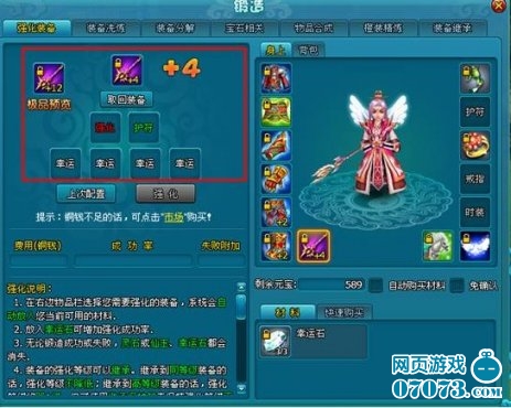 现在强化装备的话,差不多是有一个紫色武器和一身蓝色的其他装备。首先要强化的是紫色武器,对于一般玩家,强化到4就差不多了。如果有志于追求排行榜的RMB玩家,至少要强化到8的。充值礼包里面会有一个五彩幸运石,在8级强化的时候很爽的。