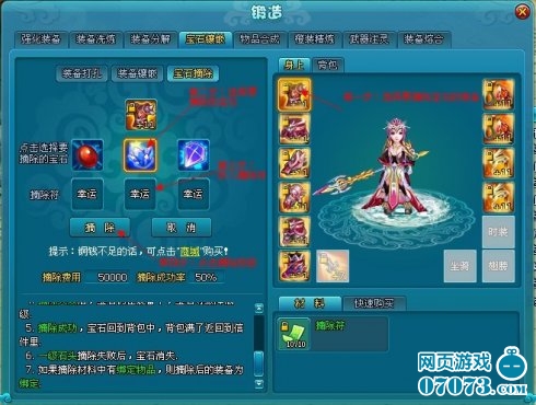 宝石摘除有一定的成功率,失败宝石会降低一个等级。可以放入摘除符提高摘除成功率。