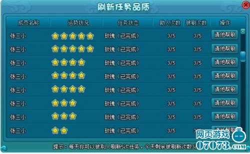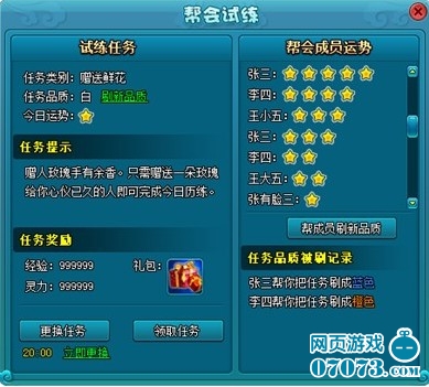 查看任务后,如果对任务品质不满意,玩家可点击任务品质旁边的“刷新品质”按钮,向帮会其他成员求助。其他帮会成员帮主刷新后,玩家的任务品质会发生改变,运势越好的玩家帮刷出高品质任务的几率越高。任务品质被刷新后,帮会试炼面板上会有任务品质被刷记录。