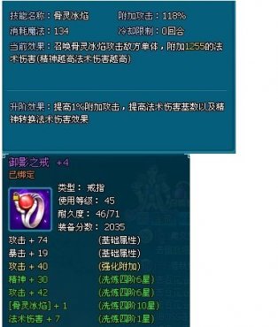 再说单打,冰焰无CD,附加伤害,精神转换伤害,不被反击、反伤、中毒,是天师的精神技!所以,精神+冰焰的武器或戒指,是单人天师的最佳选择。如果弄上3个,输出提升显著啊~