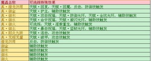 说完魔晶等级,接下来讲讲魔晶很重要的一个属性来源吧,那就是魔晶洗练。魔晶洗练刚也讲了是与魔晶等级息息相关的,魔晶的洗练属性会自动随着魔晶等级的提升而成长,每一类魔晶都可能洗出攻击、法伤、防御、气血、法力、抗性等属性,除此之外紫色品质以上魔晶还有机会洗出增加宠物技能触发几率的属性,橙色魔晶还能洗出很强悍的天赋技能,相当好用,谁用谁知道。以下是从官网找到的各类魔晶对应能洗出的特殊效果,供各位参考一下。