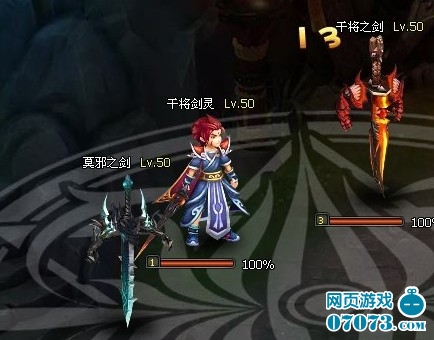 打法:一开始杀莫邪之剑,杀掉莫邪之剑后,干将之剑会殉情(干将之剑和干将剑灵都少一半血,而且干将之剑自己会中毒10000血),接着就杀干将剑灵就好了