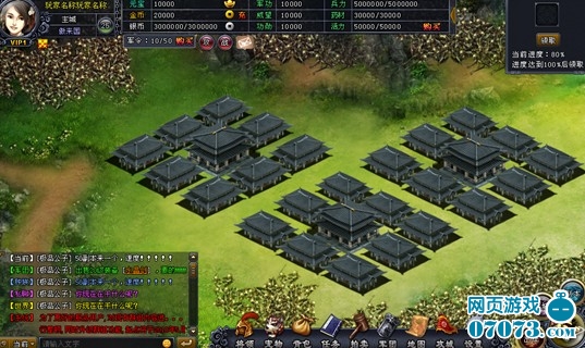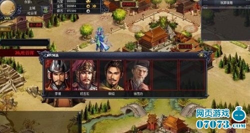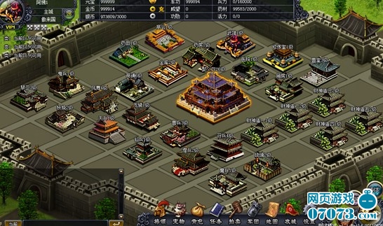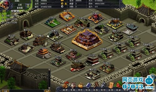 点击界面主城按钮,可进入主城界面,当鼠标移动至谋建筑物时,该建筑物发亮。点击弹出操作界面,进入下一步操作。