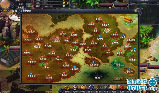 点击界面地图按钮,可进入世界地图,当鼠标移到某地点时,该地点发亮,点击该地点,则由当年地点自动寻路到该地点,并出现该地点地图。