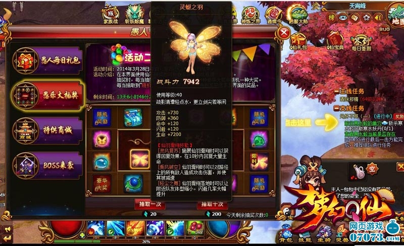 既然是愚人节,又怎么少的了幸运大抽奖环节呢!在活动期间,玩家可以通过愚乐大抽奖获得各式好礼,仙石、金翎免费得,更有几率概率获得全新推出的超炫翅膀“灵蜓之羽”,这可是只有参与活动才能获得的超豪华大礼哦,千万不能错过!