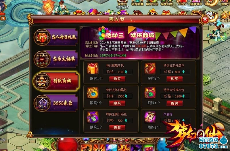 除了以上大礼,只有在愚人节期间才有的特供商城,为玩家准备了各种珍贵道具,鸳鸯玉、仙羽、坐骑升级等五大特供礼包,还有珍贵的改名符,以助众仙友能够早日问鼎天元大陆,走过路过千万不可错过呀!