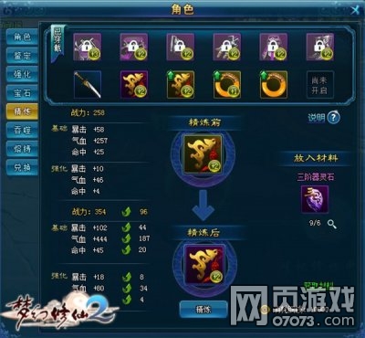 金装准备好了,灵石也准备好了,问题又来了!怎么合成?进入角色界面,在左方功能菜单中找到精炼功能,然后放入金装与素材,即可打造出高级紫装了。要注意的是,只有通过了鉴定属性的金装才能够进行装备精炼,所以想要升紫的装备,还需要花费金色鉴定符来进行鉴定哦~