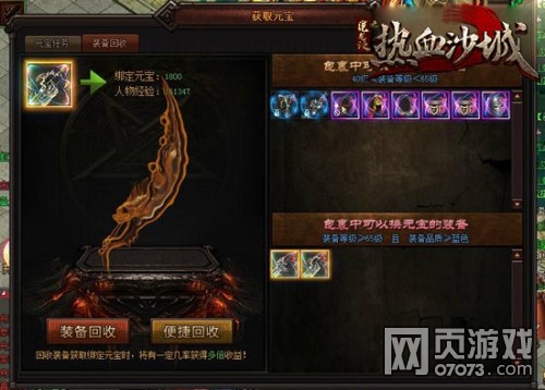 37《魔龙诀》玩家背包中可回收的装备根据品质及等级分别出现在图中上下回收栏中,等级不低于65级,品质不低于蓝色的装备出现在下面的回收栏中,回收后获得元宝,其余不低于40级的装备出现在上面的回收栏,回收后可获得大量经验;