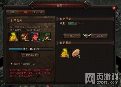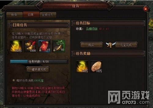 日常任务,每日只能完成20环,没换根据等级获得经验和金币,如果每天完成全部日常任务,那么除了单个任务的奖励之外,您还会获得跟为丰厚的奖励。打怪任务玩家可以通过点击任务面板的上的“前往”按钮,直接传送至任务地点,传送将消耗小飞鞋,否则自动寻路,VIP玩家可以免费传送。如果您觉得这样还是不够方便的话,还可以直接用元宝直接完成此任务,以此节约您宝贵的时间。当您接取到收集任务的时候,可以根据提示在随身商店里找到并购买任务需要的道具。