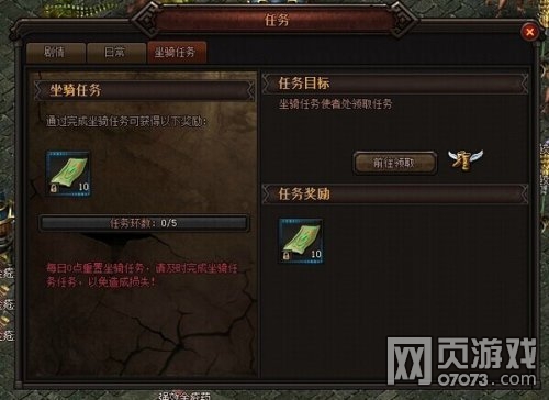等级不低于57级的玩家每天可以和坐骑任务使者接取5个坐骑任务,完成每个坐骑任务都会获得坐骑进阶符奖励。