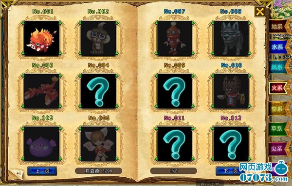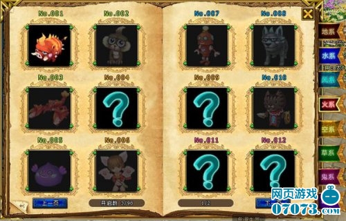 打开图鉴后看到游戏中宠物列表。列表右侧是“地、水、风、火、空、草、鬼、毒”八个宠物系别的页签,单击对应的页签即可打开对应系别的宠物。