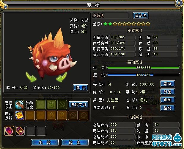 宠物属性:选中相应宠物后,其属性出现在面板: