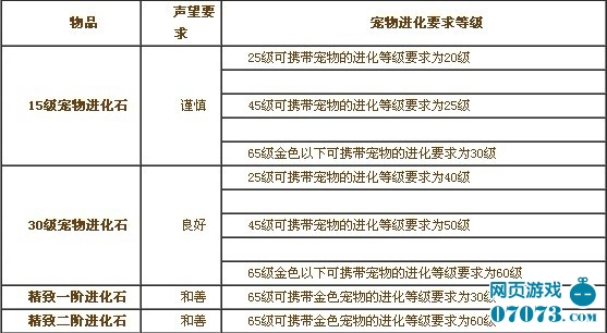 在宠物面板上,点击“进化”按钮,可弹出进化界面对宠物进行进化。低级进化石可在乐园岛宠物进化大师声望商人处通过代币购买,精致进化石则需要在乐园岛限时商店购买。