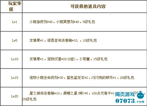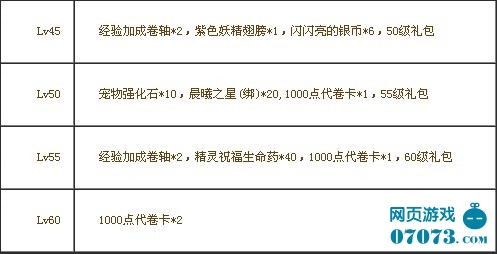 活动内容:当玩家创建角色进入游戏时,会得到免费赠送的一个1级新手礼包。该礼包随着角色等级的提高,可每5级一次获得对应等级的奖励,一直持续到60级。