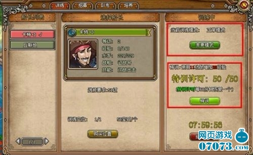 点试炼场,试炼场可以在校场内对船长进行训练提升船长的等级,特训可以瞬间增加船长的经验,特训需要消耗军功和特训许可证,特训许可证每60分钟恢复一个,校试炼场等级越高,船长训练得到的经验越多,主将等级也不会超过城市等级。随着VIP的等级提升,训练模式也会相应的改变