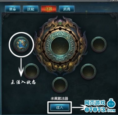 法器获得后需要穿戴进入法器面板内才可发挥效果,法器不会出现在背包中,不占用背包空间,仅在法器面板中才能看见。法器初始登记为0级,每个玩家最多可通过游戏内任务可获得5个法器,法器不可丢弃不可交易或出售。