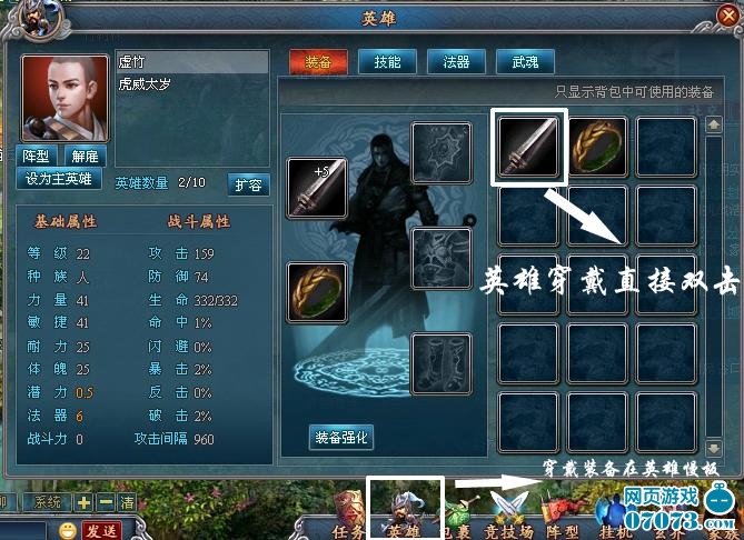左键点击画面下方的包裹(快捷键“E”),可以打开包裹。将鼠标移到包裹中某件物品上,双击左键即可使用。或者点击包裹栏的使用键,再选择需要使用的物品。穿戴装备时需要打开将领面板点击所需要装备武器,系统自动分配到装备的所应在的部位。
