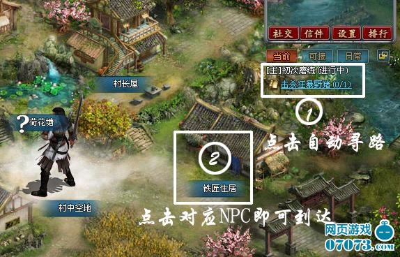 在游戏画面中,玩家所控制的角色位于其所点击的NPC或地图跳转处。需要移动位置时,用鼠标左键点击想要去的NPC或者地图跳转口即可。