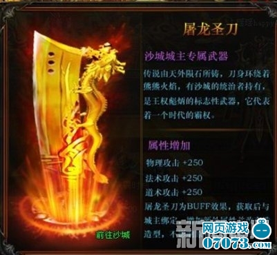 背景如此霸权响亮的武器,其属性又是怎样的呢?屠龙圣刀其实为一个BUFF效果,当沙城城主获取之后,将会变成绑定的状态,在原来武器的属性上,额外增加BUFF属性值,并改变武器的外形,成为一把名符其实的圣刀。具体的属性加成上,主要是为各项攻击增加250点属性值。
