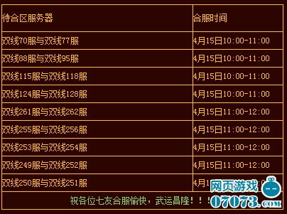 非常感谢大家一直以来对七杀的热爱与支持!为了给大家提供更加优质的游戏环境,感受更多的游戏乐趣,提高游戏的可玩性和互动性,应广大玩家的需求,我们将会在4月15日对以下服进行数据互通合服操作。届时玩家可以通过原有账号登陆数据互通后的服务器,对此给您带来的不便,敬请见谅,合服之后,将开展更多精彩活动,期待您的归来!其他服的合服安排请留意官网公告,本期合服安排预告如下: