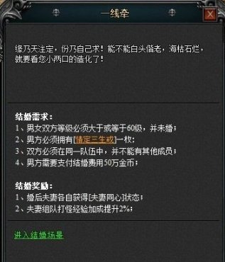 除了有一枚“情定三生戒”之外,男方再支付50W的绑定金币就能轻轻松松把老婆大人抱回家!结婚时两位新人将会在婚宴殿堂里,在众多兄弟姐妹的见证之下开始行礼仪式。仪式过后,两人正式结为“夫妻玩家”,共同获得“夫妻同心”的属性状态。结了婚之后两位玩家的命运就算是连在一起了,夫妻玩家组队打怪时,获得的经验加成还会提升2%。
