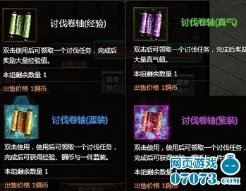 讨伐卷轴有四种类型,分别是经验卷轴,真气卷轴,蓝装卷轴,紫装卷轴。