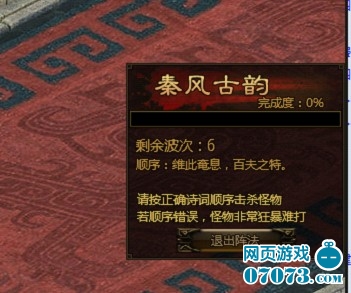 如果击杀过程中不是按照顺序击杀,那么这时会刷出一批大秦勇士。同时原有的怪物会附带一个30秒的无敌的BUFF,所以想一次性把怪物全部群死的同学可以放弃了。大秦勇士属性很高而且数量较多,玩家如果不慎打错,记得快速使用轻功跳跃,在地图四周楼梯上都可以避免秦兵追击,坚持30秒秦兵消失就能够继续活动,届时碰到之前误伤的那个字直接跳过即可。
