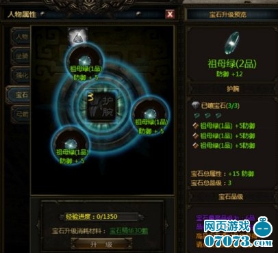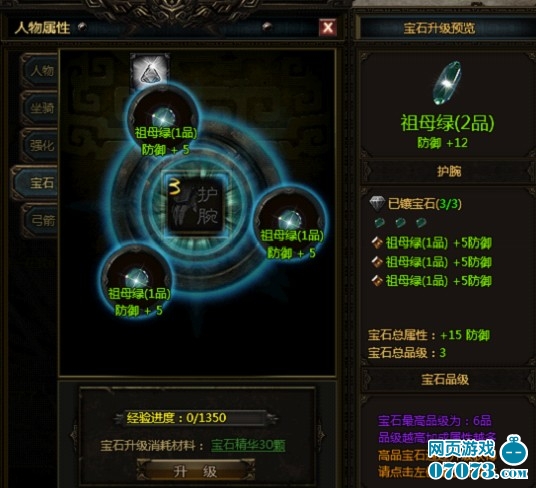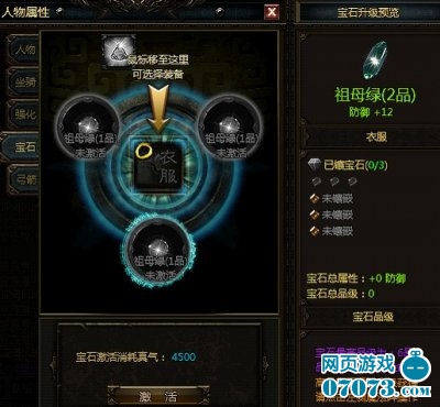 游戏中可以镶嵌宝石的部位分为十处每一处可以镶嵌三颗同样的宝石,分别是武器,衣服,护腕,护腿,鞋子,头盔,项链,戒指,佩绶和腰带。每个部位所镶嵌的宝石种类均已固定,这样能够让玩家很方便的选择自己最需要的属性进行优先投入,而且宝石属性不会随着换装而消失,就算玩家未穿戴的装备也会拥有那个部位的宝石效果,所以说宝石是一个很值得玩家投入的系统。最开始时各处的宝石均为未激活状态每激活一颗宝石需要消耗4500点真气,激活后宝石显示为宝石所附带的属性且宝石为高亮状态。当把一个位置的三颗宝石全部激活后会出现升级宝石的字样,升级宝石需要消耗宝石精华,宝石精华在游戏中比较容易获得。