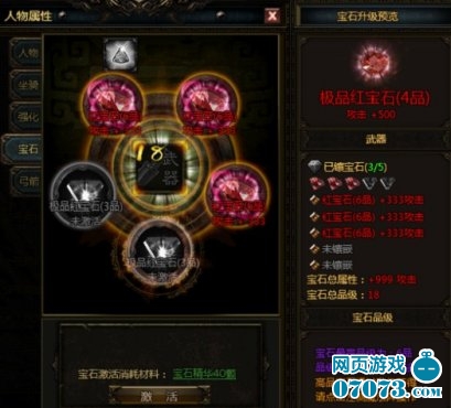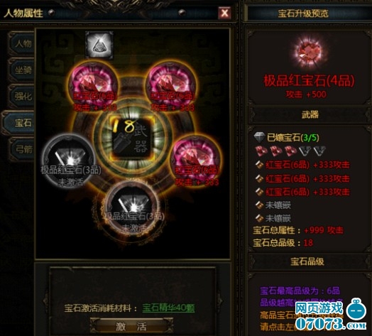 当玩家将前面三颗宝石全部升级为六品时,会出现极品宝石,极品宝石是需要40颗宝石精华来激活,激活之后极品宝石直接呈现三品。极品宝石能够大幅提高能力。