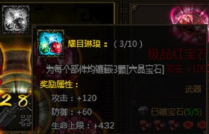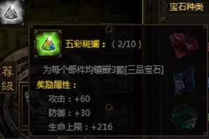 当身上所有部件都镶嵌三颗三品宝石,会出现“五彩斑斓”套装属性,额外增加攻击,防御,及生命上限。