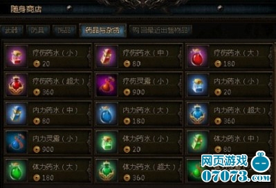 疗伤药水(中)/内力药水(中),回500生命/150内力,一组8000铜(方便计算)。