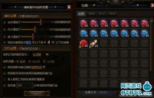 当然,挂机不需要2种药都买,一般只买蓝,或者只买红,(主要买一种,另一种至少要放个1组在身上,免得挂机设置里面会默认你没有药水把你传回去打坐了)。下图是我的挂机设置和包裹最简单配置(为了写文章买的药,一般只要一种)。