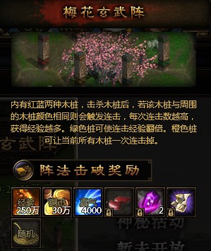 接下来在说说最简单的梅花玄武阵,这个得的东西也是很令人心动的,这个得到的经验就不比《水淹大梁》了,这个也是和自己的等级挂钩的,等级越高得到的经验就越多。有很多人进去之后挂机就不管了,这样也能得到很多经验,但是有点浪费时间,进去之后会有一个小面板可以操作。连击越高得到的经验就越多,而且是最多打1000个梅花桩就会出来BOSS,所以我们进去之后就全地图挂机,然后选择相同颜色连着比较多的,有黄色的梅花桩就跑过去打,在最后打了大概990+的时候,如果有黄色就快点跑过去,这样我们就可以超过1000个梅花桩,得到的经验也多,而且里面还有绿色的梅花桩,绿色的梅花桩是经验奖励翻倍的。最后打完BOSS就出来了,可以挂机了。