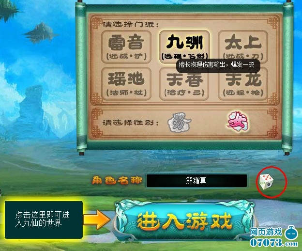 当您在创建一个新角色时,每个门派都可以选择男女性别的角色,并且可以使用自动取名功能,挑选一个既拉风又炫的好名字开始闯荡九仙世界。
