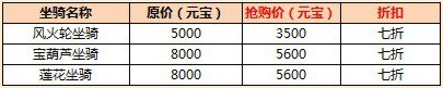 2、热门极品坐骑最低仅售7折! (购买方法:在游戏商城——坐骑相关类直接购买,价格已修改为7折抢购价!)