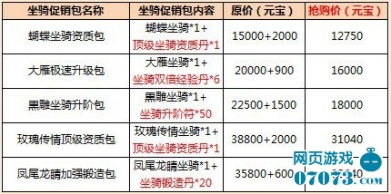 坐骑促销礼包,多种拉风坐骑最低只要8折!是的,你没看错,是8折就能获得一个凤尾龙睛加强锻造包还有额外赠送的20个坐骑锻造丹!更有玫瑰传情顶级资质包低至8折即可拥有,蝴蝶坐骑资质包更是赠送一个“顶级坐骑资质丹”!若您是蓝钻或黄钻贵族,从QQ游戏大厅或QQ空间登录游戏再享8折!低至5.6折特大让利!