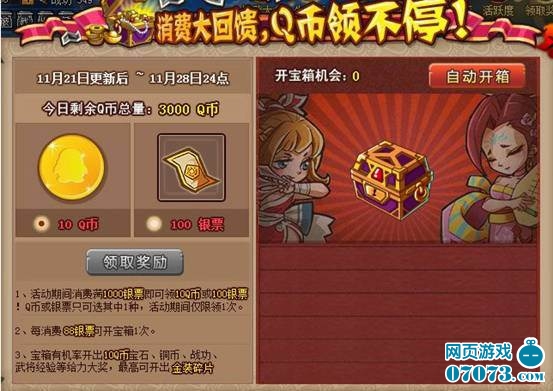 活动期间,消费满1000银票即可领取10 Q币或100银票。Q币或者银票只可选择其中1种,活动期间限领1次。