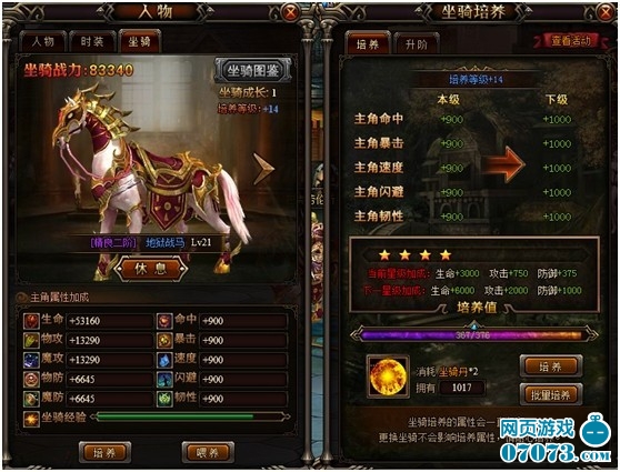 坐骑培养:消耗坐骑丹进行培养,提高坐骑培养等级,对主角的命中,暴击,速度,闪避,韧性进行提升。