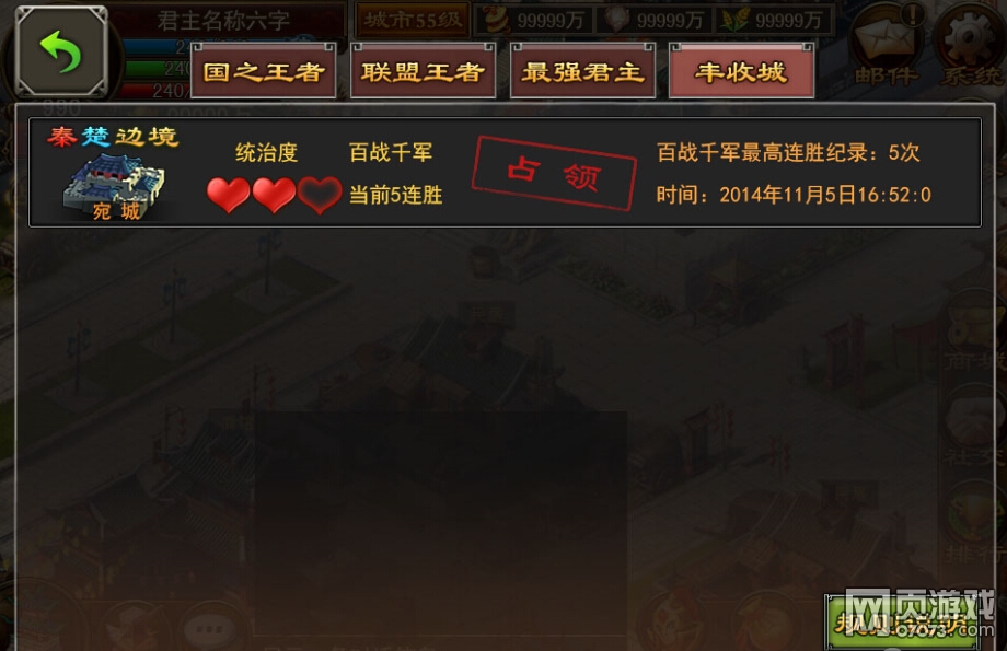 下图所示:楚国占领“宛城”,联盟“百战千军”成为占领者,当前统治度为4