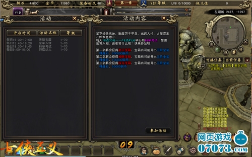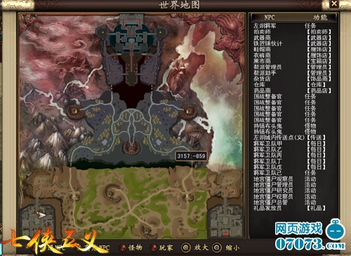 游戏内地图也很有特色,不是传统的网页游戏的模式,而是一张整体地图。到达地图任何地方都不需要读条加载。在大地图上还有详细的NPC寻路指向和坐标标识,考虑的很是周全。但是缺点就是大地图略显粗糙。