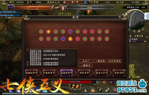 在七侠五义OL中的纹身又是怎样的呢?七侠五义OL中纹身是用来增加特定属性的道具。在强化系统中打开纹身界面,选择获取纹身,界面显示6大刺青师分别是:低级刺青师、中级刺青师、高级刺青师、刺青宗师、刺青大宗师、刺青鼻祖。点击低级刺青师开始随机获得纹身,有一定几率成功获得纹身,也可能偶遇高一级的刺青师。中级刺青师以及更高级的刺青师处获取纹身失败将会返还1000铜钱作为补偿。VIP5功能走后门可以直接从刺青大宗师处获得纹身,使用一键购买直接得到所有的纹身。通过一键获取功能将所有纹身放入刺青包。打开刺青包查看所有获得的纹身。选择一键吞噬所有的纹身,即是将所有的纹身合成一个高级纹身,属性能力也大大加强。双击纹身直接镶嵌到纹身孔中。同种类型的纹身只可以装备一个。不同的纹身分别从外攻伤害,外功防御,抗必杀等不同方面增加属性。初期玩家只有一个纹身孔,侠义等级越高,开的纹身孔越多。
