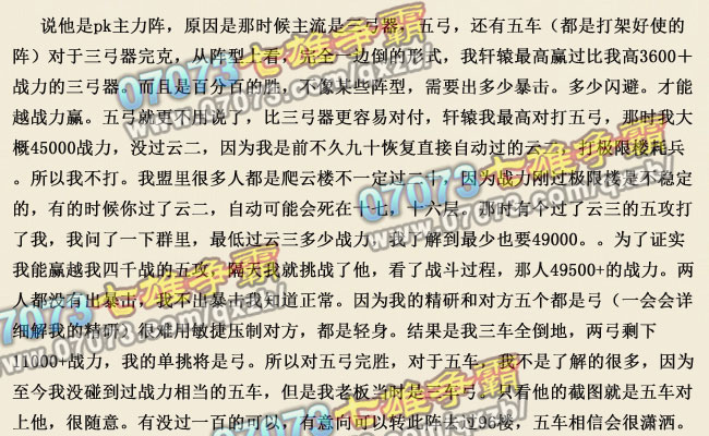 说一下三车两弓遇到其他阵型。。。战力相当的情况下,遇到三车两器,一般都是败的多,排兵差距不大,遇到两车器一弓,就看谁的暴击多了。。不出意外,五五算输赢。还有一步两弓器,三段阵型,玩车的都知道结果,像那些弓打头阵的,很容易。。相对来说此阵还是很给力的,缺点就在爬楼死兵多。。。消耗有点重。重楼,百战,轩辕都不错,值得羊多的试试,要是钱多,给三车砸减速,能打败三车器!!