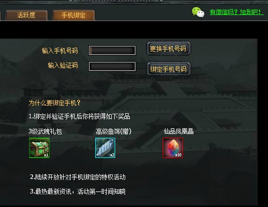 2. 上线“手机绑定限时有奖”活动。玩家们在9月20日之前,完成QQ号码绑定手机号码的任务,即可领取到丰厚的活动奖励。