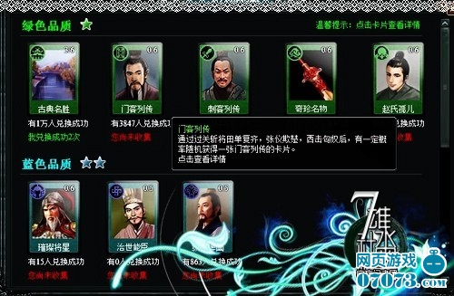 首先你可以点击卡片合成选项,进入到了奖励兑换界面,在界面中会显示你当前所拥有的卡片,集齐一套后点击兑换奖励就可以了,这样就能兑换到很不错的奖励哦!另外当你收集齐一套卡片就会获得集卡积分,收集的卡片品质越高,获得的奖励就越丰厚,得到的积分也就越高,积分的多少决定了七雄卡片的排行,这里有积分的计算规则如下: