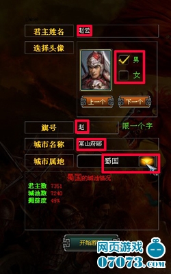 首次进入热血2,您需要创建属于您的君主并建立您在热血2的征途中开疆辟土的基地——主城。输入君主名,选择性别和头像,输入旗号和城市名称,选择城市所属国家,点击“开始游戏”,您就可以在热血2王国中拥有属于自己的城池,开始您的征服战斗之路。