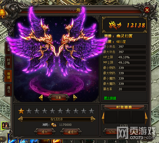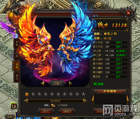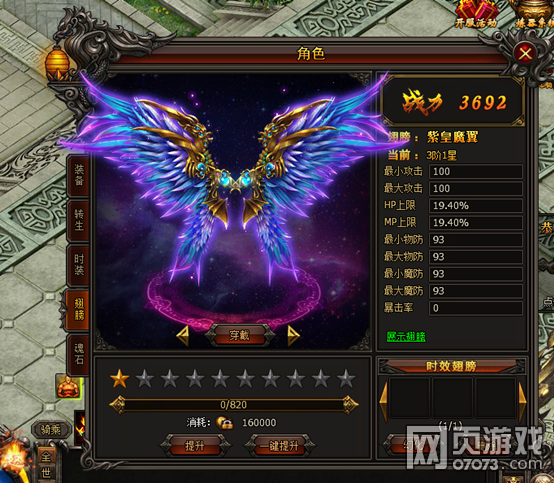 翅膀一共有8阶10星。先通过消耗绑定金币提升至10星,再消耗“翅膀进阶符”进阶至下一阶。每升一星均有属性增加,进阶可获得大量属性和更加绚丽的造型。